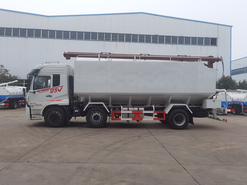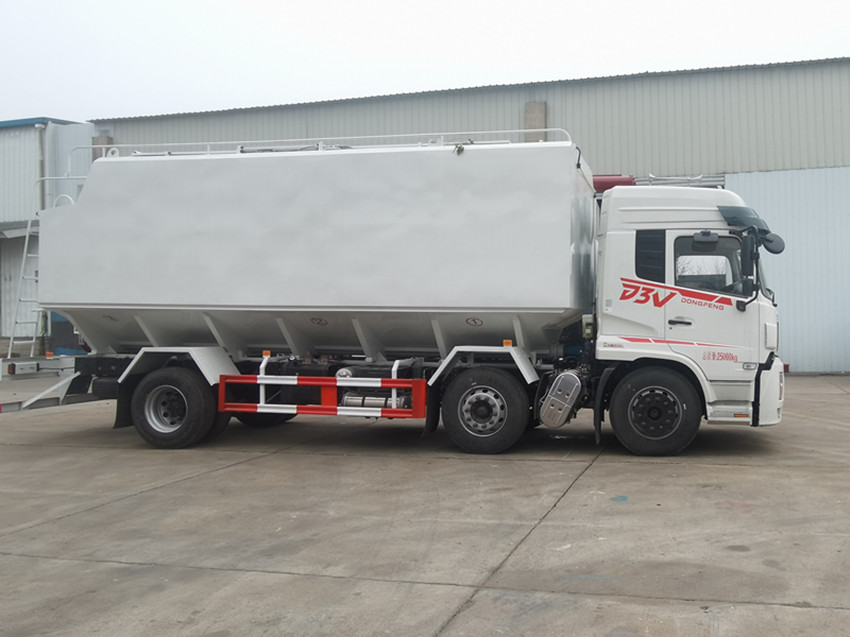 散裝飼料運輸車,散裝飼料車的飼料罐架設在卡車的底盤上,罐頂開有進料口.頂部的一根螺旋輸送卸料管(俗稱卸料絞龍)則可自由回轉和抬升,抬升的仰角可達60度。運輸時,頂部的螺旋管平臥在罐頂;卸料時則抬起,使管端的出料口與畜禽飼養(yǎng)場貯料罐頂部的進料門相接,駕駛室內裝有操縱裝置(操縱裝置也可裝置在罐體尾部),卸料時通過車底的動力輸出軸和減速器來驅動螺旋,以完成卸料。