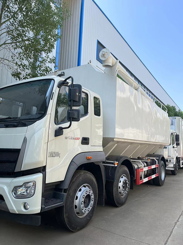 散裝飼料運輸車,散裝飼料車的飼料罐架設在卡車的底盤上,罐頂開有進料口.頂部的一根螺旋輸送卸料管(俗稱卸料絞龍)則可自由回轉(zhuǎn)和抬升,抬升的仰角可達60度。運輸時,頂部的螺旋管平臥在罐頂;卸料時則抬起,使管端的出料口與畜禽飼養(yǎng)場貯料罐頂部的進料門相接,駕駛室內(nèi)裝有操縱裝置(操縱裝置也可裝置在罐體尾部),卸料時通過車底的動力輸出軸和減速器來驅(qū)動螺旋,以完成卸料。