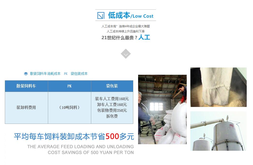 1 經(jīng)濟(jì)效益、勞動(dòng)時(shí)間等對(duì)比 項(xiàng)目 袋包裝 飼料罐 裝卸費(fèi)用(1噸飼料) 18元(人工) 2元(電耗) 包裝袋費(fèi)用(1噸飼料) 20元 0元 裝車時(shí)間(10噸飼料) 60分鐘 20分鐘 卸車時(shí)間(10噸飼料) 60分鐘 30分鐘 從上表中可以直觀的看出:1.在裝卸費(fèi)用上,散裝運(yùn)輸比袋包裝運(yùn)輸要節(jié)約16元/噸。2.在包裝費(fèi)用上,散裝運(yùn)輸比袋包裝運(yùn)輸要節(jié)約20元/噸。3.在裝卸時(shí)間上,散裝運(yùn)輸比袋包裝運(yùn)輸要節(jié)約70分鐘。通過以上統(tǒng)計(jì)分析發(fā)現(xiàn),散裝飼料運(yùn)輸車經(jīng)濟(jì)效益非常明顯。